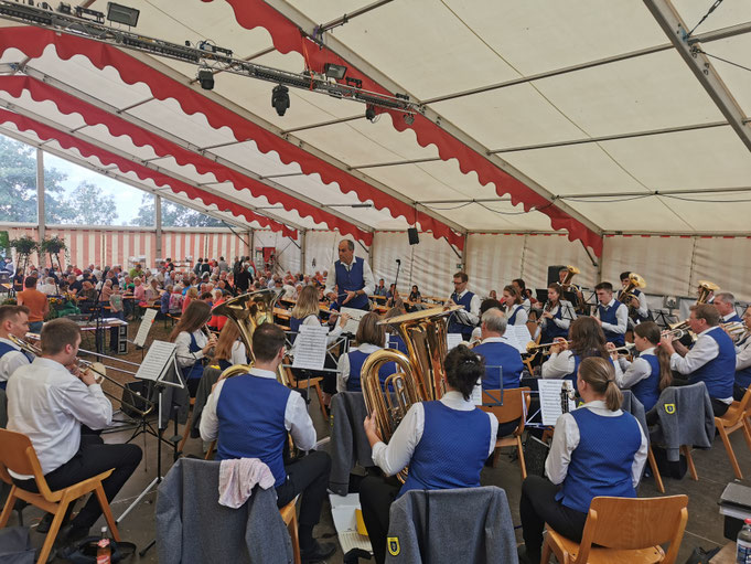 Anmoderiert wurden wir, vom Musikverein Liebersbronn mit 'wir haben den Regen weg geblasen und ihr bringt die Sonne mit'. Danach musizierten wir 6 Stunden lang, nach der Aussage von unserem Rüdi. Naja ganz so lange war es dann doch nicht, aber die 2,5 Stunden vergingen wie im Flug.