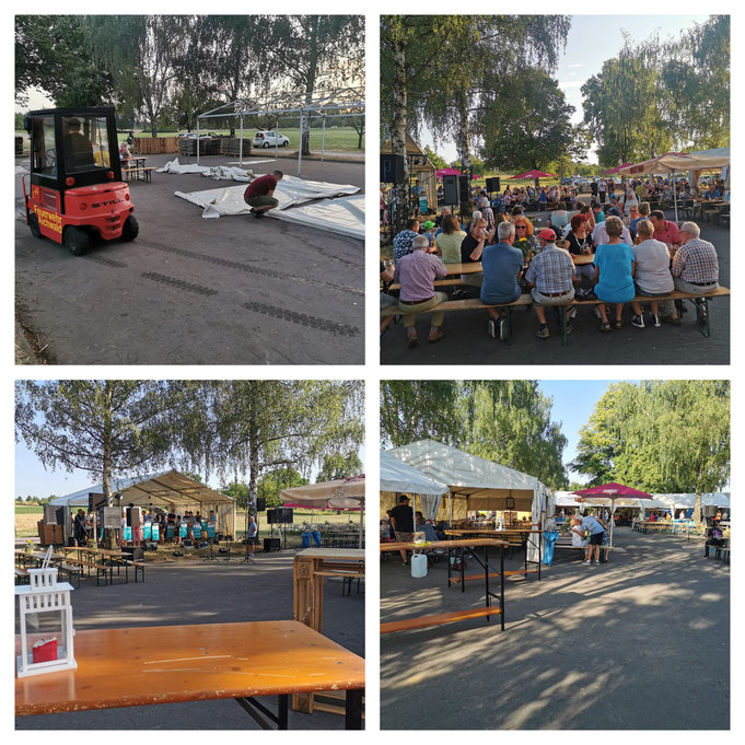 Donnerstagmorgen und der Aufbau beginnt. Es sind reichlich helfende Hände da und so steht erst das eine Zelt, dann das andere und auch die Bar ist äußerlich schon Einsatzbereit.